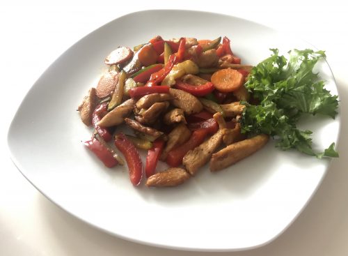 Meso popečemo na kokosovem maslu, dodamo še zelenjavo, vse skupaj začinimo in pražimo še 3 minute.