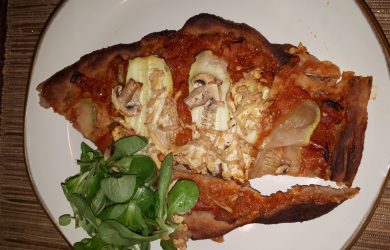 Testo: 250g posnete skute 250 g pirine polnozrnate moke 1 vrečka suhega kvasa 1 merica beljakovin (Old School PROTEIN Vegan) Paradižnikova omaka: 4 paradižniki 1 čebula česen v prahu sveži peteršilj kajenski poper zeliščna sol Nadev: nariban navadni tofu 1 bučka narezana na trakove sveži šampinjoni Postopek priprave: Mešanici iz moke in beljakovin dodamo suhi …