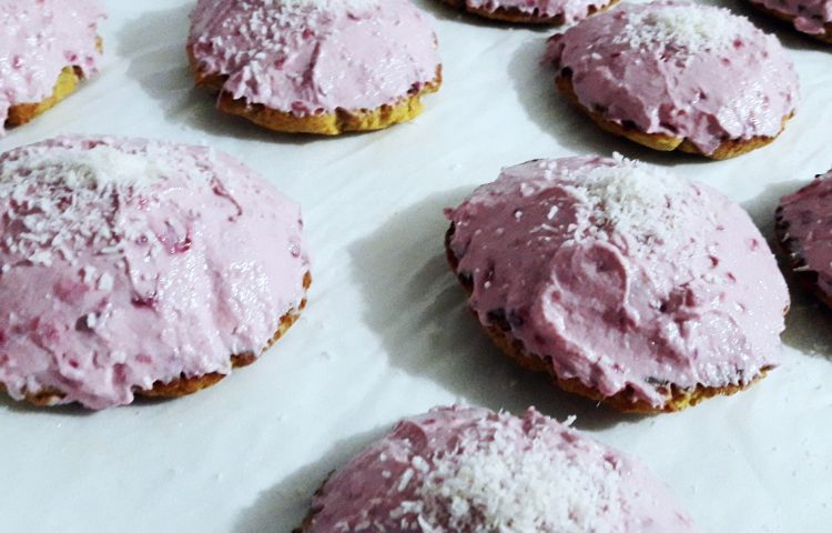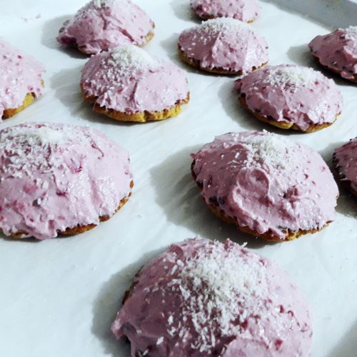 Maso za piškote pečemo v pečici cca 20 min na 180 C. Pečene piškotke namažemo z Meridian Coconut& Peanut butter in obložimo z nadevom.