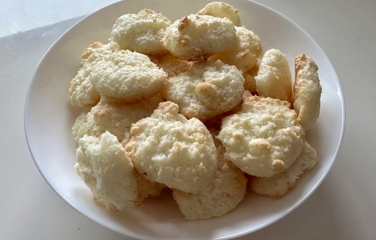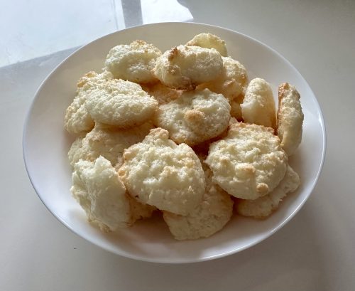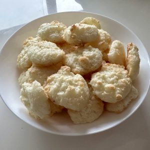 Iz beljakov naredimo čvrst sneg, dodamo eritritol in kokosovo moko in z žlico oblikujemo manjše kepice. Položimo na peki papir in pečemo 10-15 minut na 180 C.