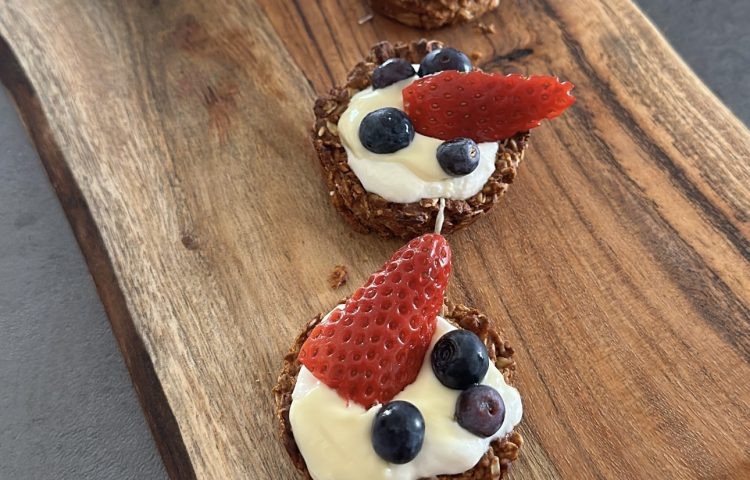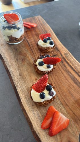 Košarice obložimo z grškim jogutrom, belo čokolado in sadjem. Zdrobljene lahko uporabimo namesto granole.