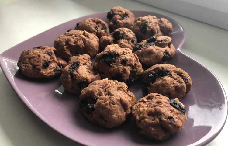 V posodi zmešamo naslednje sestavine: moka, 2 jajci, kokosovo olje, THE Amino Whey, pecilni prašek in dodamo jagodno aromo. Zmesi dodamo nasekljane orehe, sušene brusnice in koščke temne čokolade ter vse skupaj dobro pregnetemo. Oblikujemo manjše kroglice in jih položimo na peki papir. Pečemo na 180 C 10 min.